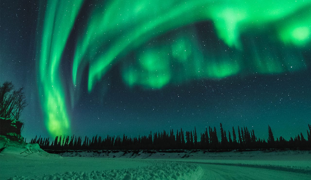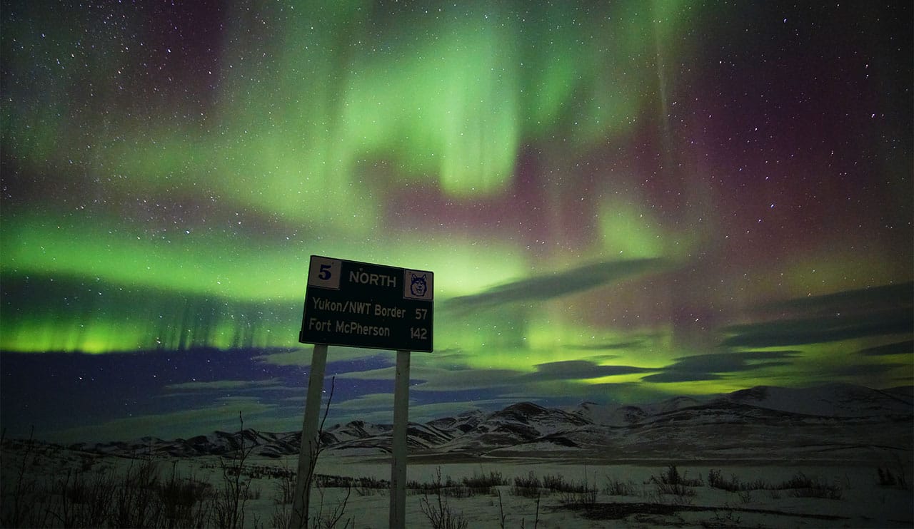 As you head off into one of the longer stages after enduring consistent low temperature, driving winds and the solitude of the frozen Peel River, you'll begin to see the Northern Lights over Inuvik - your next destination.