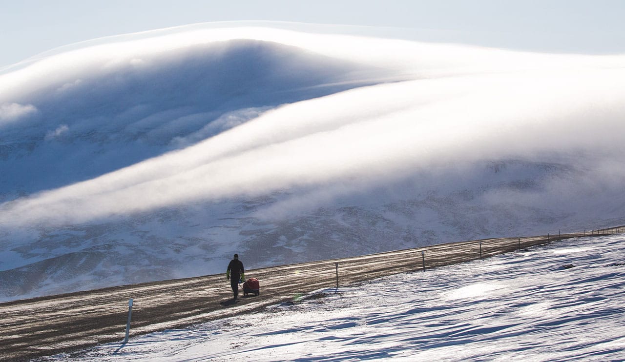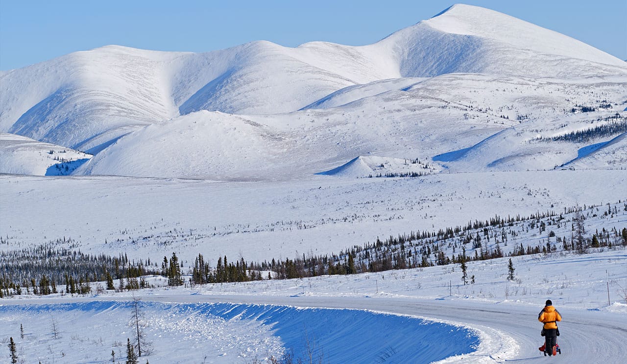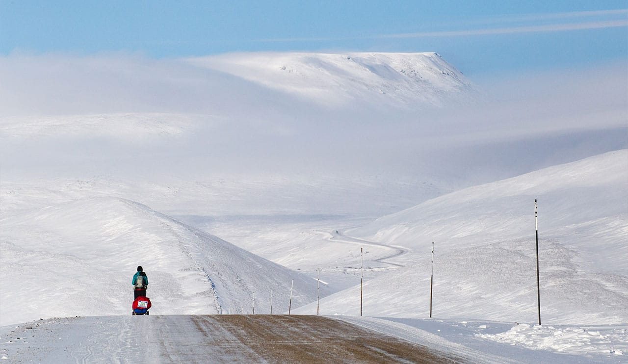 Over distances of 120+ miles or the full 380 mile route, competitors follow the historic Dempster Highway and frozen ice roads deep into the Canadian Arctic. You’ll cross from the Yukon into the Northwest Territories, traversing Hurricane Alley and Wrights Pass as you move through the surreal stillness of endless snowfields and Arctic sky.